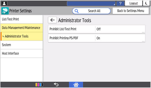 - Configure this in [Settings] > [Printer Settings] > [Data Management/Maintenance] > [Administrator Tools] > [Prohibit printing PS/PDF] using Smart Operation Panel.