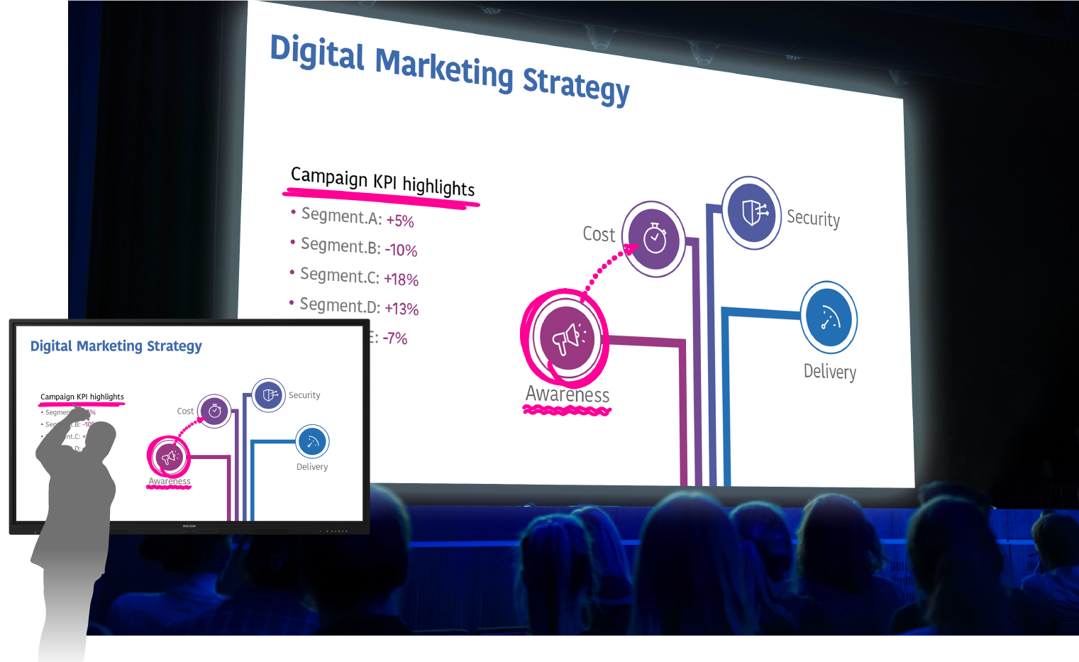 By outputting the video signal to a large screen such as a projector, your presentation will have a great impact even in large halls. You can also make your presentation smarter through real-time sharing of not only images but also written content.