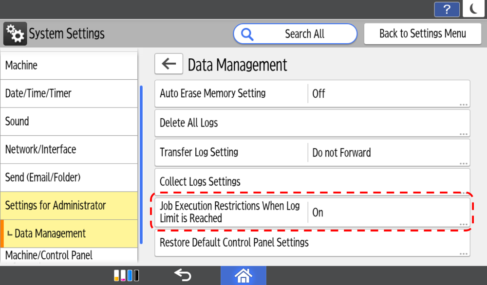 To protect the integrity of the job log, it is now possible to restrict job execution when the job log is full. When this setting is enabled, the device will stop printing and alert the administrator and user when the job log is full.