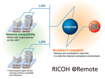 RICOH @Remote is a new remote service for networked output devices connected in a LAN/Broadband environment, letting customers use them with greater convenience and peace of mind.