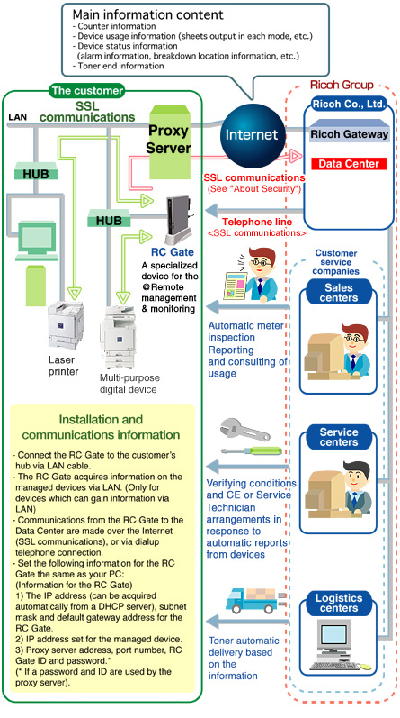 - Communications between RC Gate and Ricoh, and between devices and RC Gate, use the SSL system (*).*SSL (Secure Socket Layer), a protocol with added data encryption, is widely used in applications such as Internet shopping.