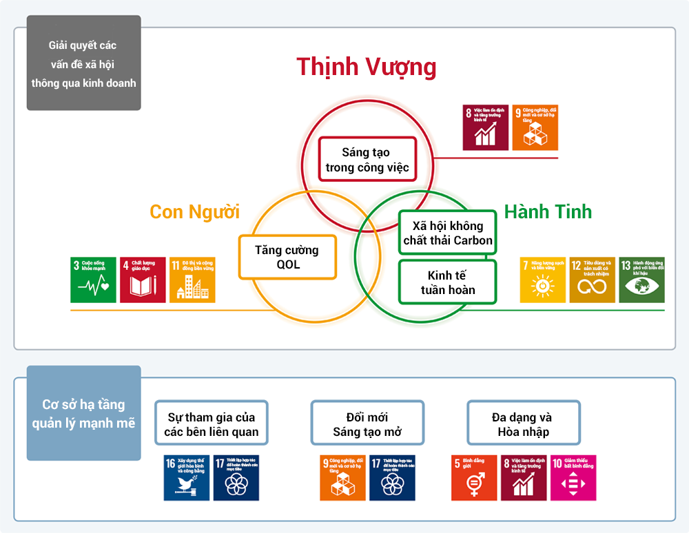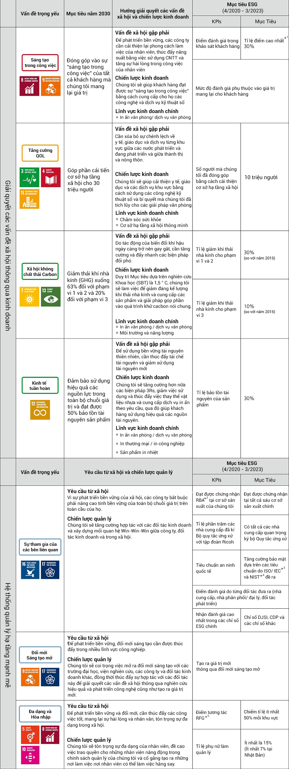 Đối với tập đoàn Ricoh, một xã hội bền vững là một xã hội trong đó bao gồm sự cân bằng ba yếu tố Thịnh Vượng, Con Người và Hành Tinh luôn được duy trì. Để tạo ra một xã hội như vậy, Ricoh đã xác định qua bảy vấn đề quan trong trong hai lĩnh vực “Giải quyết các vấn đề xã hội thông qua kinh doanh” và “Hệ thống quản lý cơ sở hạ tầng mạnh mẽ” thông qua tuyên bố sứ mệnh của Ricoh, Kế hoạch quản lý Trung hạn (MTP) và sự kỳ vọng đến từ các bên liên quan. Hơn nữa, Ricoh đã đặt ra 14 mục tiêu ESG liên quan đến từng yếu tố trọng yếu và tất cả mọi người, bao gồm cả quản lý và nhân viên, đang nỗ lực đạt được những mục tiêu đó với nhận thức cao. Khẩu hiệu “ Các doanh nghiệp không đóng góp vào SDGs sẽ bị loại bỏ” vì thế Ricoh sẽ tiếp tục tích cực thúc đẩy các nỗ lực nhằm hiện thực hóa một xã hội bền vừng bằng cách giải quyết các vấn đề xã hội
