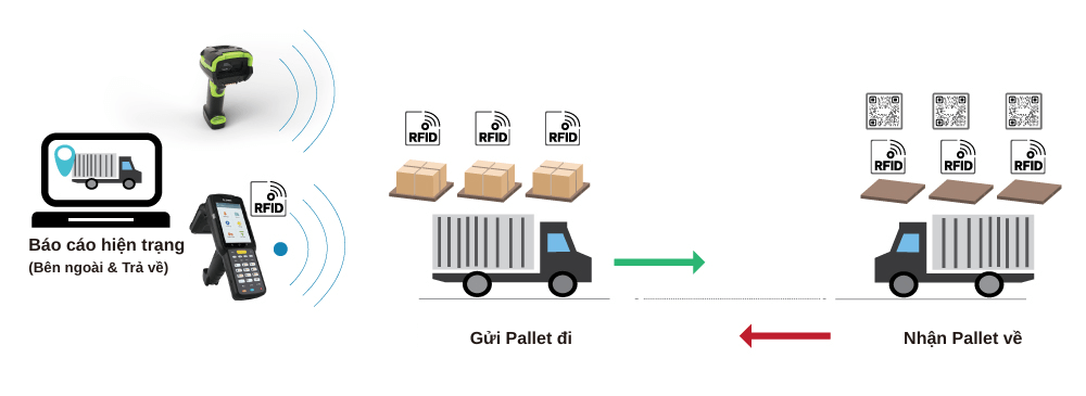 Mỗi pallet sẽ được xác định bằng mã vạch hoặc mã RFID, chứa thông tin như số pallet, kho, thông tin người nhận và ngày trả lại.